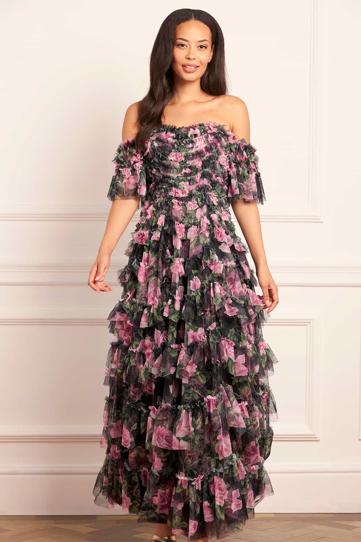 NEW SEASON. The Rose Vine Aviana Off-Shoulder Gown in Graphite. Blending the sculptural tulle frills of Needle & Thread’s signature Aviana silhouette with embroidered rose vines, drawn from 19th-century prints. Rows of scallop frills add texture and volume, while the off-shoulder neckline frames the décolletage. The trailing rose embroidery softens the silhouette, this gown captures the mystery and grandeur of the Bright Star collection.