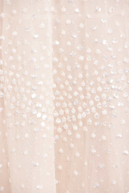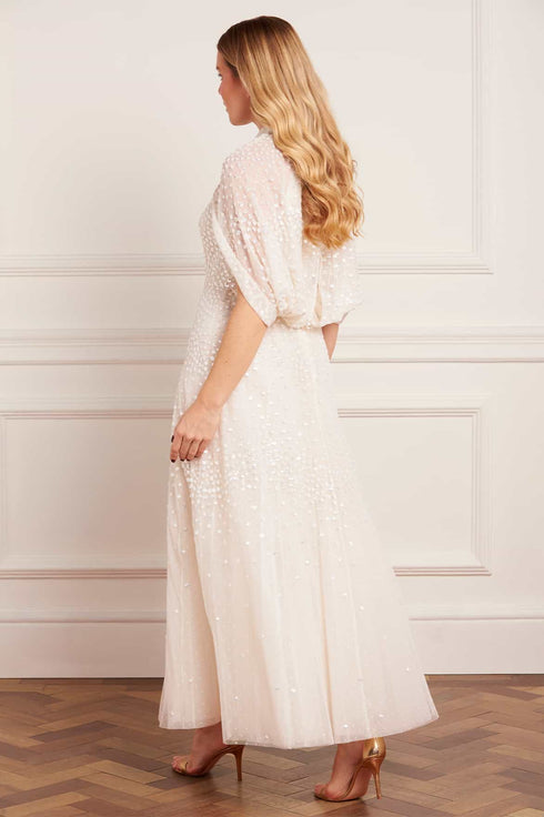 NEW SEASON. The Scallop Sequin Cape Ankle Gown in Cream. An elegant high-neck style with a blouson chiffon cape that gathers at the waist. Embellished with glittering sequins, it creates a dramatic yet graceful statement for evening occasions.