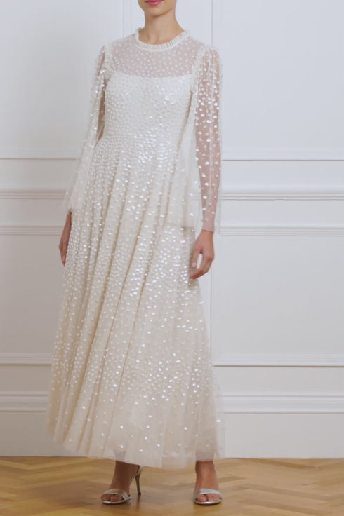 The Scatter Dot Round Neck Ankle Gown in Cream.This embellished gown is decorated with exquisite shimmering dot motifs, undulating in wave formations for a captivating glittering effect. The round neck bodice is trimmed with signature Needle & Thread tulle trims at the neckline and shoulders for romantic detailing. The elegant long fluted sleeves are adorned with tiny sparkling sequin motifs, and the skirt is made up of generous layers of net and tulle with a sweeping hemline. This magical piece is perfect for an upcoming special occasion and beyond.