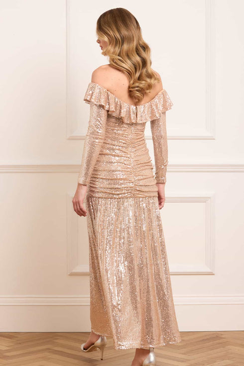 The Sienna Off-Shoulder Gown in Butterscotch. This elegant gown features a dramatic off-shoulder neckline adorned with delicate circle-cut frills. Crafted from sheer sequin fabric with tiny 3mm sequins hand-stitched onto stretch mesh, it offers a soft, fluid shimmer throughout. Flattering ruching shapes the bodice, while an internal stretch power mesh corset provides comfort and support. Finished with soft boning, grosgrain ribbon detailing, and adjustable fastenings, this piece blends modern glamour with couture craftsmanship.