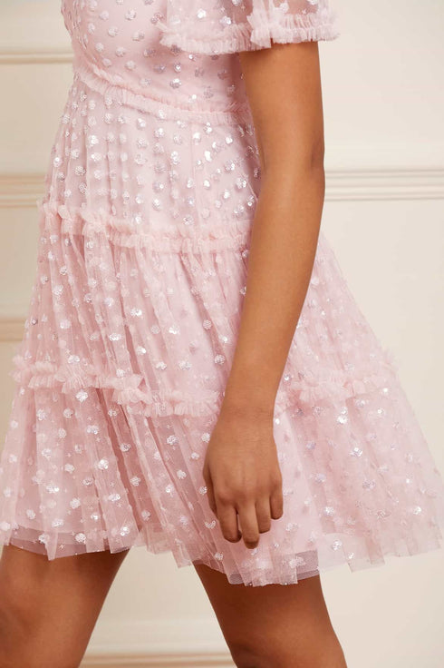 The Thea Mini Dress in Dusk Pink. This mini dress is scattered with polka dot sequin motifs to create an enchanting shimmer throughout. Developed with signature Needle & Thread 'x' motif tulle adding subtle detail. Make a special appearance in the Thea at your next event.