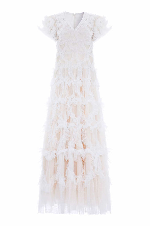 The Amorette V-Neck Gown in Cream. A signature Needle & Thread style; beautifully adorned with our key love heart motif, made from gently gathered delicate tulle. Designed with romantic, frothy sleeves created using layers of delicate tulle and frills for a statement look. Featuring a generously voluminous skirt layered with tulle and net for a full, magical silhouette. A textile piece you'll forever treasure.