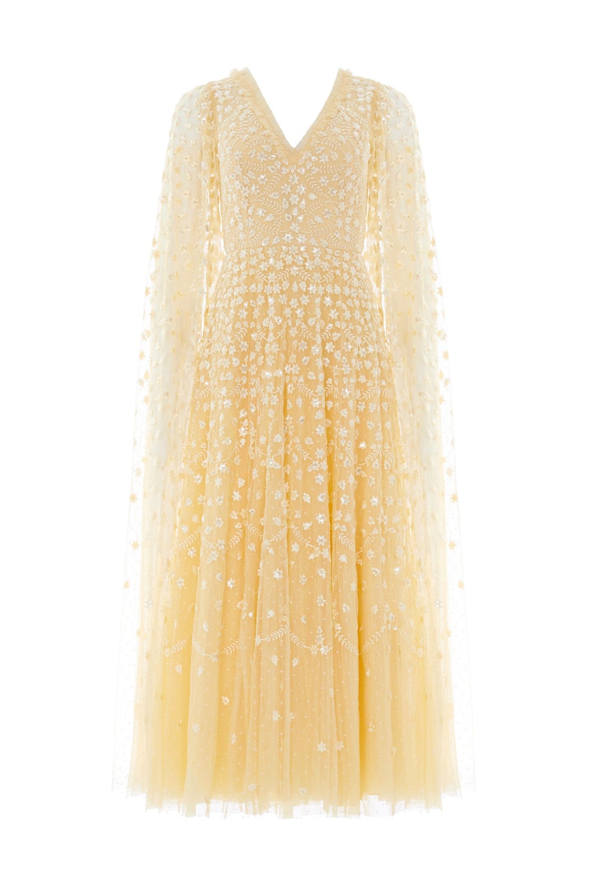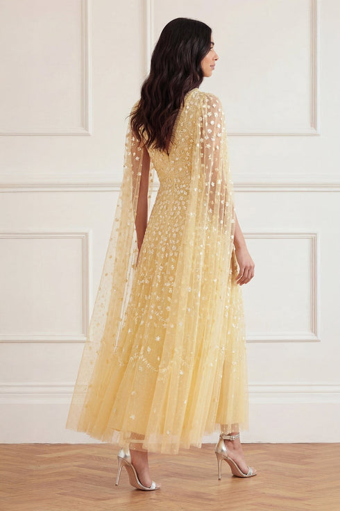 NEW SEASON. The Clover Cape Sleeve Ankle Gown in Citron. Inspired by romantic garden blooms, this ankle-length gown features soft cape sleeves that drape elegantly over the arms. Finished with a flowing silhouette for graceful movement and refined occasionwear styling.