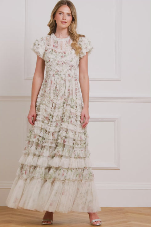 The Colette’s La Vie En Rose Round Neck Short Sleeve Gown in Moonshine/Cream. A dreamy silhouette adorned with delicate tulle frills. Soft ruffles follow the seams of the gown, while romantic florals from the Colette’s Rose print bloom across the moonshine-toned base. A gentle round neckline and short sleeves offer a flattering finish, ideal for refined dressing.
