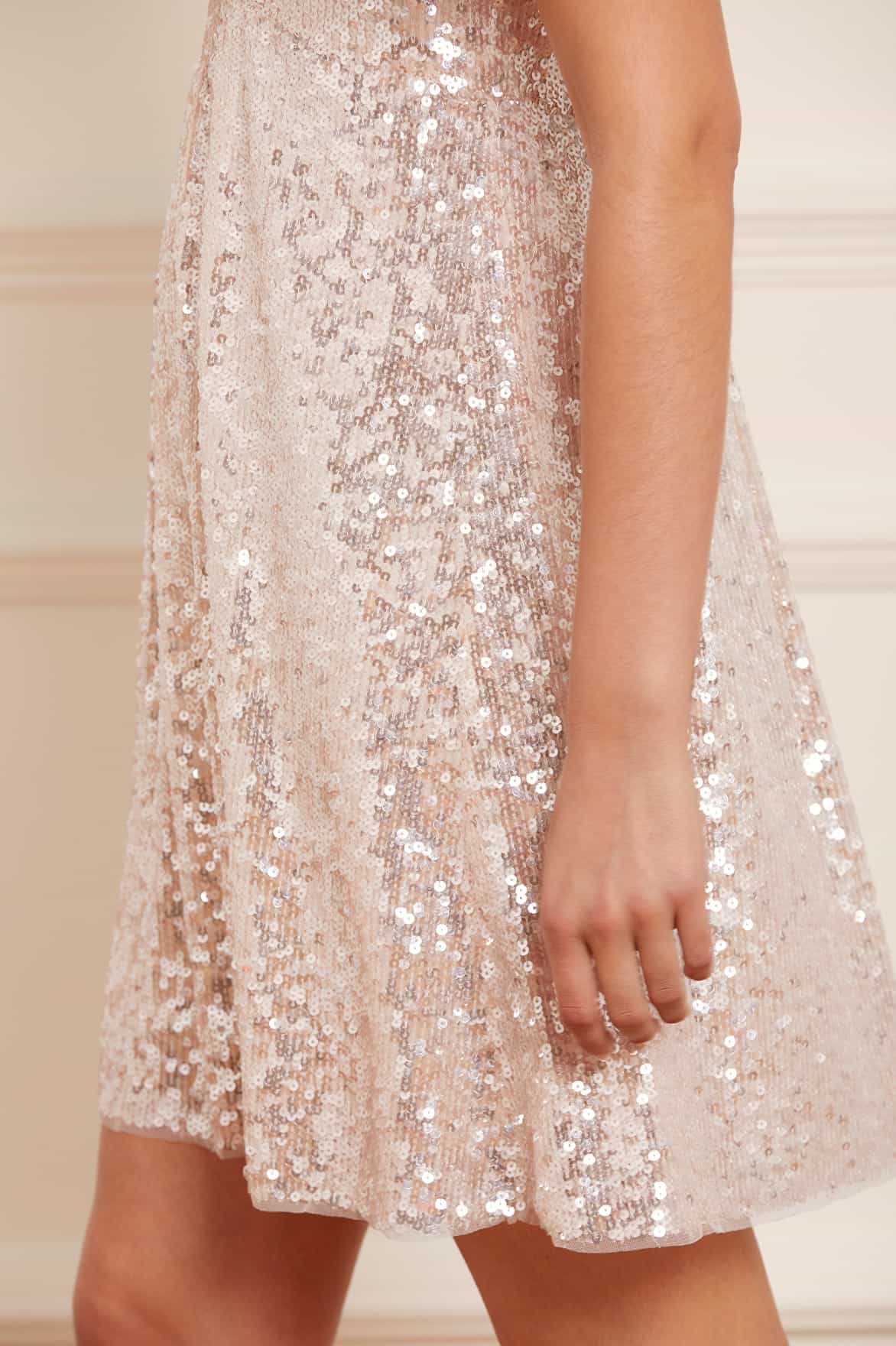 The Mila Gloss Mini Dress in Cream. This magical piece is designed with specially sourced gloss sequins creating an extra sparkle effect. Developed with perfectly placed panels and pleats to create an effortlessly, flattering silhouette inspired by a 1930's tea dress. Make a striking appearance in the Mila.