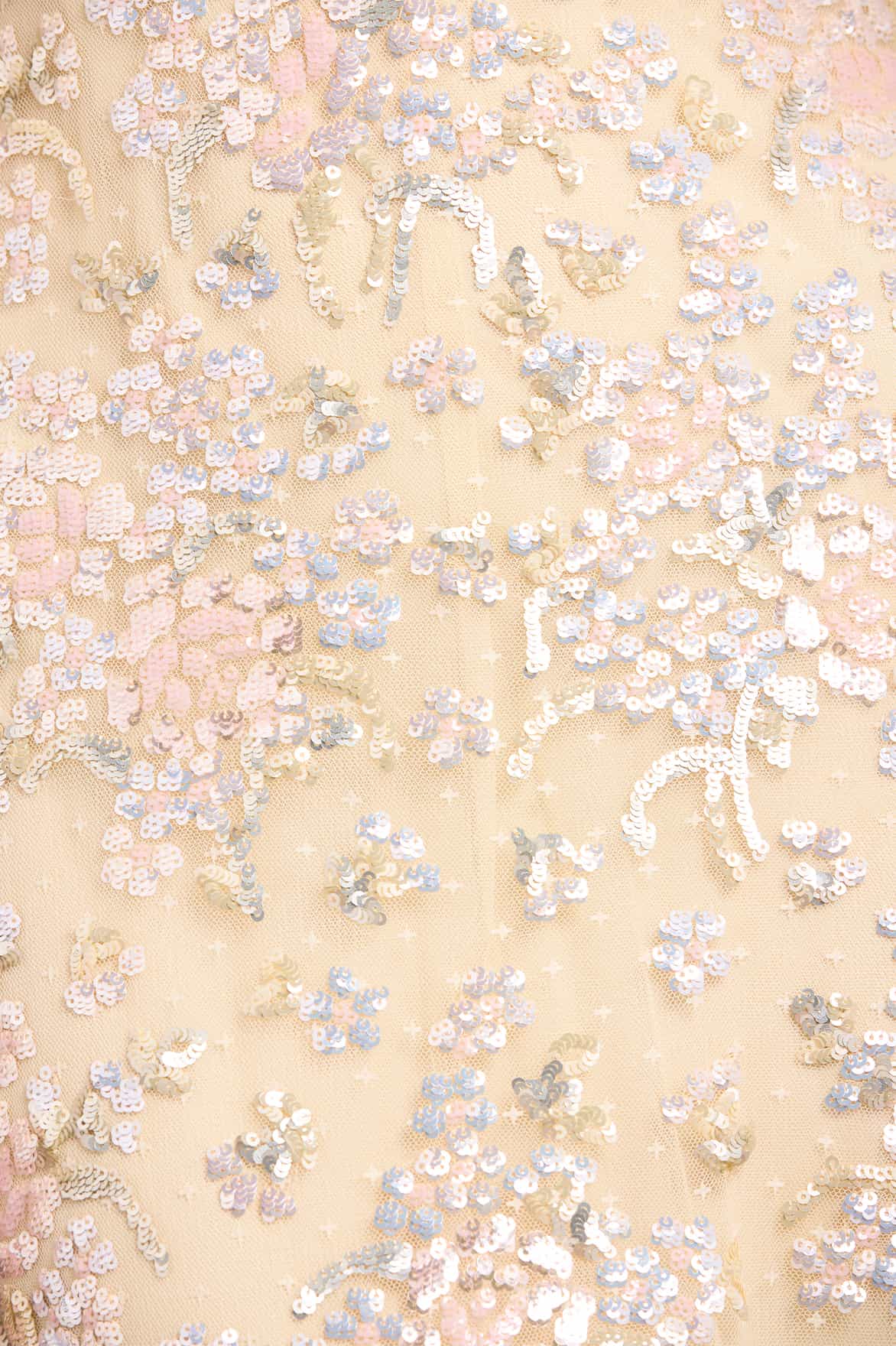 NEW SEASON. The Peony Bouquet Sequin V-Neck Cape Gown in Lemon Sorbet/Multi. Exquisite sequin floral artwork inspired by antique botanical paintings adorns this elegant gown. Designed with an integrated cape and a slim silhouette, it is finished with a bias-cut lining for a smooth, body-skimming fit and effortless wear.