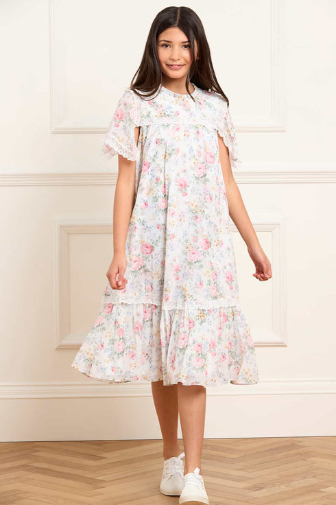 The Pompadour Garden Chiffon Lace Kids Dress in Moonshine. This dress features hand-painted floral bouquets and trailing ditsy motifs, inspired by the Palace of Versailles. Designed with delicate lace-edged handkerchief sleeves and a loose, comfortable fit adds vintage charm. Crafed with signature Needle & Thread frills at the neckline and a softly gathered, lace-edged skirt creates a perfect twirl-ready look.