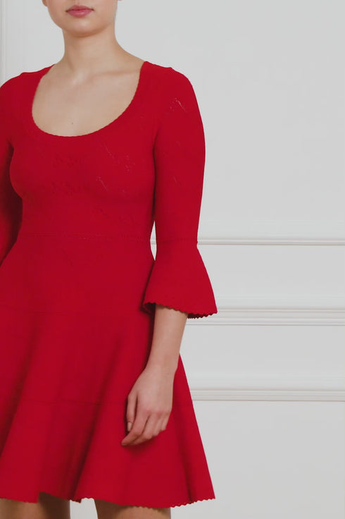 The Pretty Pointelle Knit Scoop Neck Mini Dress in Red. A brand new style for Needle & Thread. This knitted dress is inspired by vintage ditsy florals and lace. Beautifully designed with all-over pretty pointelle stitch, delicate florals and scallop details. This dress has a fitted stretch bodice with a soft, feminine neckline, fluted cuffs and signature Needle & Thread detailing. A truly flattering piece.
