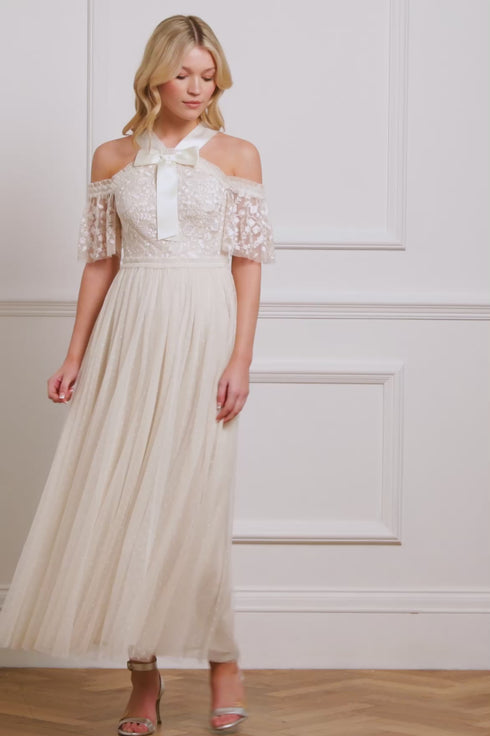 The Primrose Bodice Ankle Gown in Cream. This gown features delicate tonal embroidery on the bodice, inspired by antique lace. Designed with satin ribbon straps and a bow elegantly accent the neckline, while cold shoulder detailing and romantic fluted sleeves add a feminine touch. The skirt, crafted from layers of soft Needle & Thread tulle, creates a dreamy, romantic silhouette. A versatile gown perfect for any occasion.