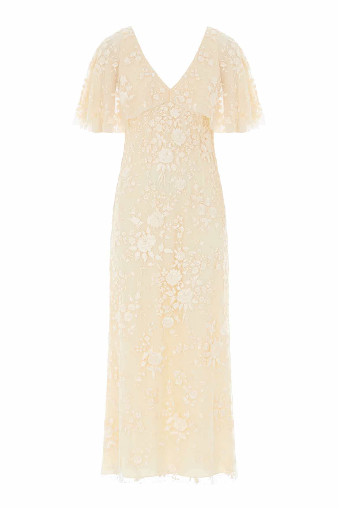NEW SEASON. The Rosa V-Neck Cape Gown in Lemon Sorbet. This elegant gown features signature floral embroidery inspired by romantic garden landscapes. Designed with an integrated cape and a slim silhouette, complemented by a bias-cut lining for a smooth, body-skimming fit and effortless wear.