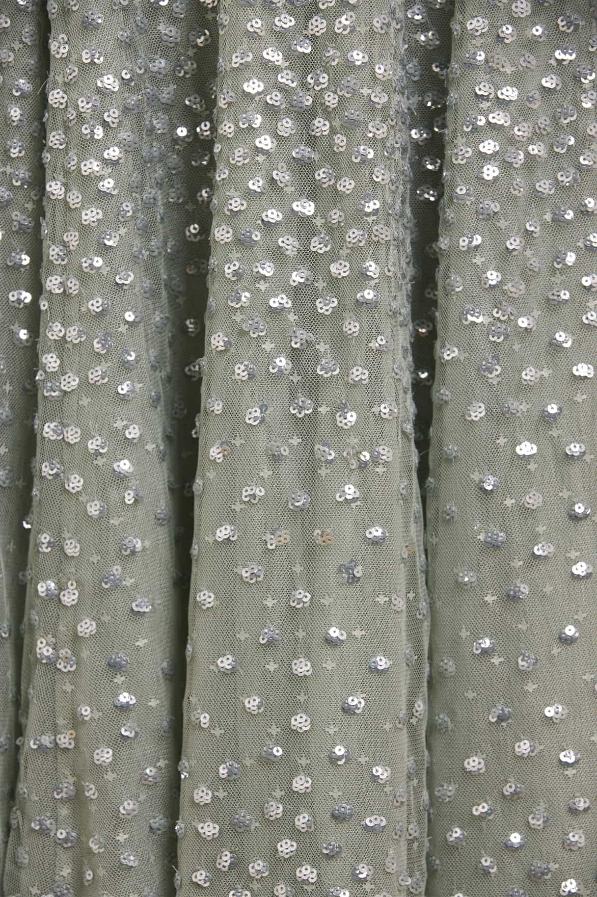 The Scatter Dot Cape Sleeve Ankle Gown in Laurel. This embellished gown is decorated with exquisite shimmering dot motifs, undulating in wave formations for a captivating glittering effect. Designed with a sweeping floor-length cape for romantic detailing and a statement look. The flattering square neckline is trimmed with signature Needle & Thread tulle frills. The skirt is made up of generous layers of net and tulle with a sweeping hemline. The perfect choice for an upcoming special occasion and beyond.