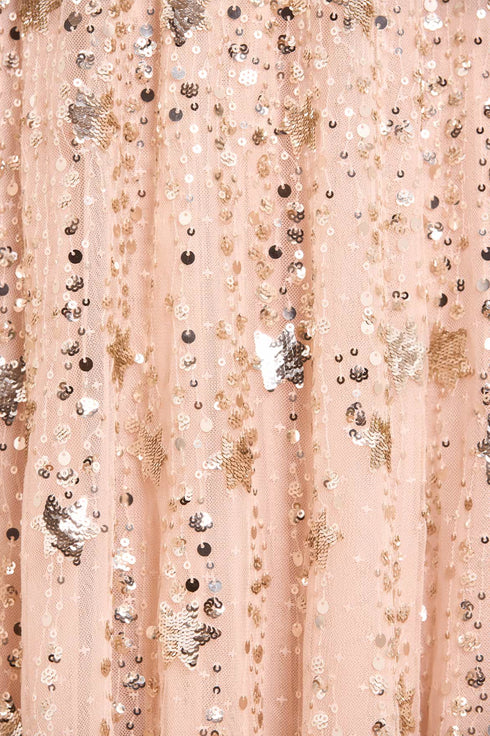 The Shooting Stars Long Sleeve Ankle Gown in Dust Beige/Silver. Beautifully adorned with shimmering embellishments of intricate star motifs, with clusters of tiny sparkling sequins that scatter towards the hem, create a captivating effect. Inspired by the extravagant costumes worn by the Follie’s dancers of the early 1900s, this romantic gown features blouson sleeves adorned with glittering celestial motifs in countless tiny sequins, complemented by signature Needle & Thread tulle frills. The skirt boasts generous layers of net and tulle, culminating in a sweeping hemline. This gown captures the magic of fairytales and the beauty of the night sky.