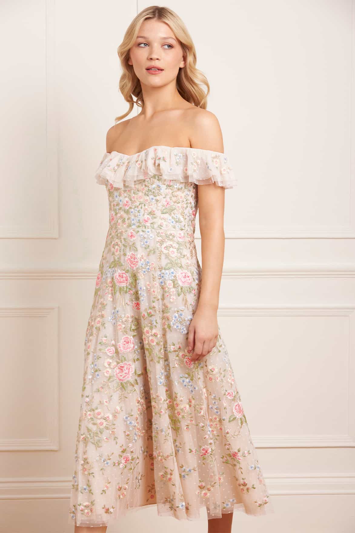 The Antoinettes Floral Off-Shoulder Ballerina Dress in Cream. Inspired by the grandeur of Versailles, this ballerina dress features delicate, multicoloured floral embroidery trailing elegantly to the hem. The off-shoulder neckline is framed with playful circle-cut frills, while layers of soft net and tulle create a full, floaty skirt with a sweeping finish. A magical blend of romance, drama, and fairytale charm.