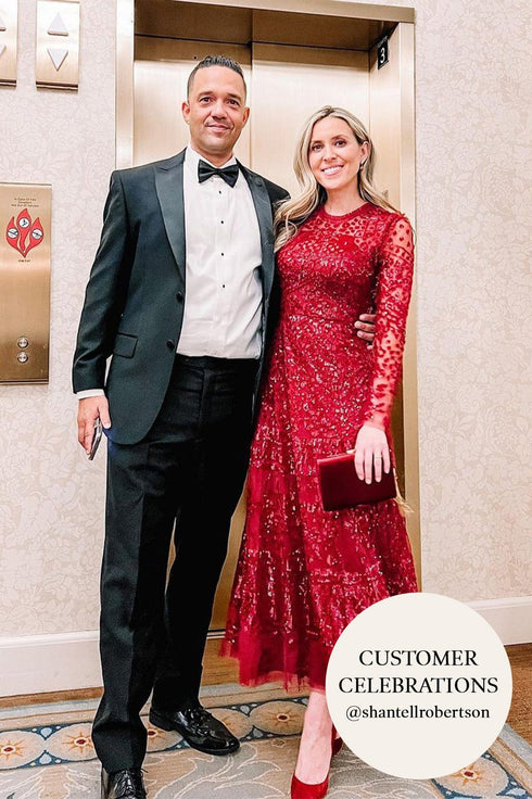 NEEDLE & THREAD EXCLUSIVE. The Aurora Ballerina Dress in Cherry Red. This light-catching ankle-length dress is decorated with red shimmering sequins, and was inspired by a vintage lace tablecloth. The Aurora Ballerina is a long-sleeve dress with pretty floral elements, and a flattering silhouette. There is delicate frill lace detailing around the neck and arm for further intrigue. Style yours with an on-trend hair ribbon for the perfect look.