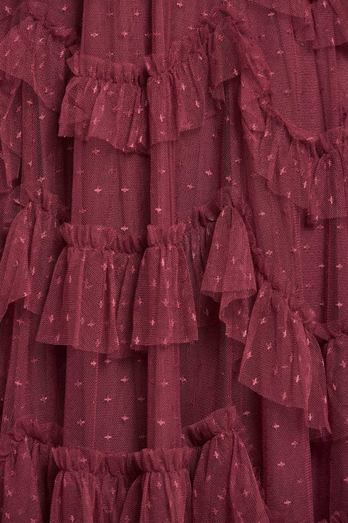 NEW SEASON. The Aviana V-Neck Gown in Winterberry. Rich in tone and romantic in spirit, the Aviana V-Neck Gown brings a seasonal flourish to this iconic silhouette. Featuring cascading scallop frills in deep berry tulle, this piece is crafted to float with every step. The V neckline offers a modern balance to the frothy construction; a striking choice for festive evenings and events.