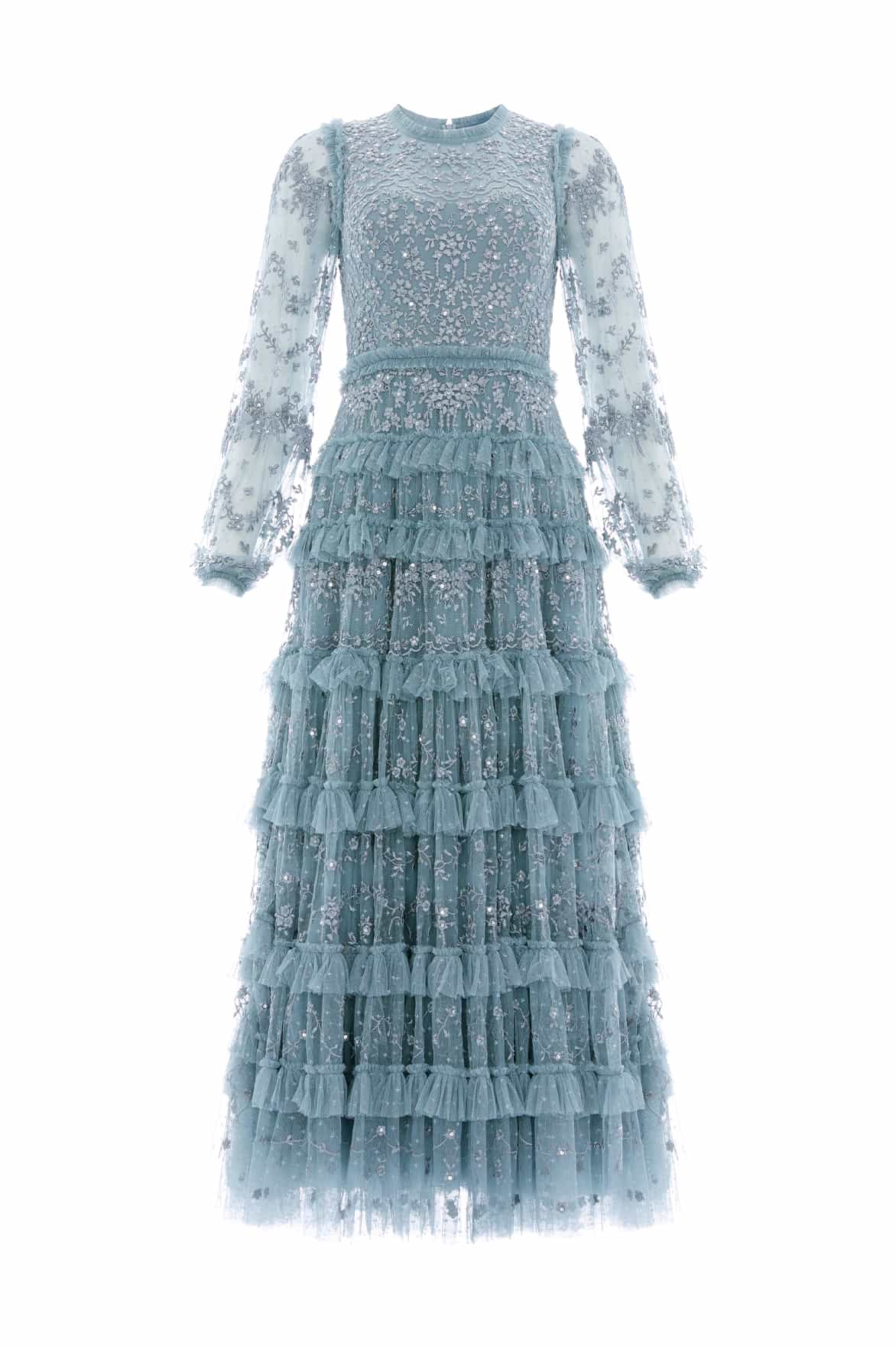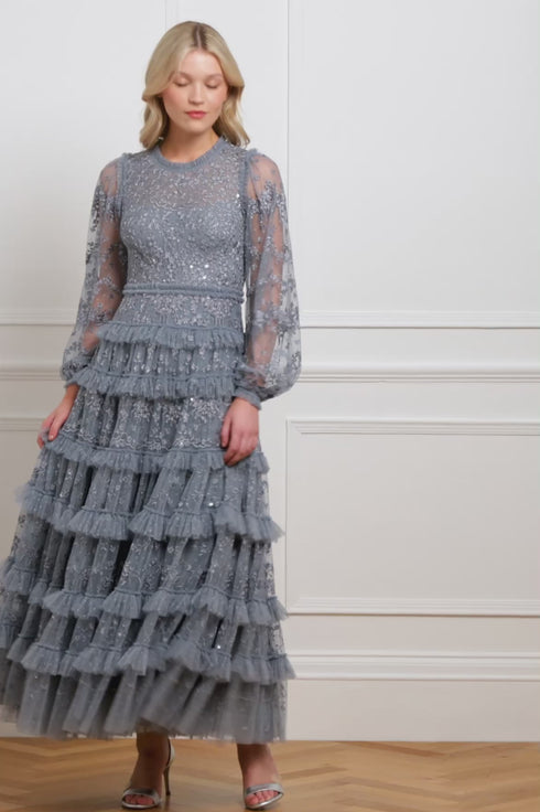The Blossom Lace Ankle Gown in Thistle Blue. A statement gown full of timeless elegance. Designed with a voluminous silhouette and cascading layered frills, this gown is adorned with delicate embroidery and subtle clear sequins that catch the light with every movement. A structured net layer adds definition, enhancing the gown’s dramatic shape. A truly show-stopping piece, perfect for unforgettable moments.