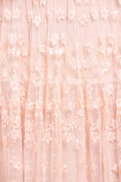 The Clover Short Sleeve Ankle Gown in Opal. A softly romantic piece inspired by vintage lacework. Featuring intricate embroidery in floral and scalloped patterns, the artwork fades into whimsical swirls as it reaches the hem. Finished with short sleeves and layered tulle, this gown is perfect for elegant celebrations and feminine dressing.