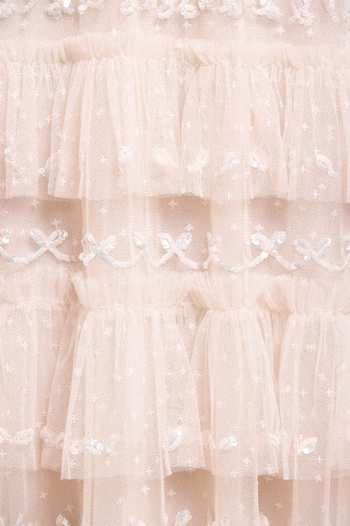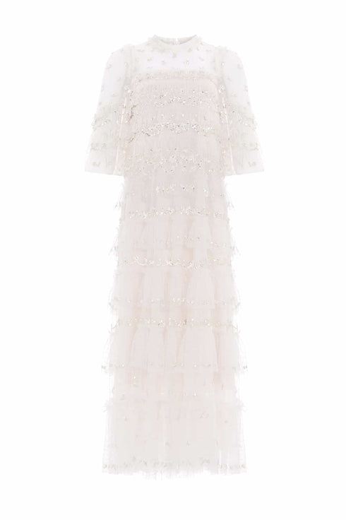 NEW SEASON | NEEDLE & THREAD EXCLUSIVE. The Emily Lace Ankle Gown in Cream. This gown features delicate sequin embellishments in vintage-inspired border designs. Signature Needle & Thread tulle frills cascade gracefully down the silhouette, increasing in size toward the hem for a dramatic, sparkling finish. Fluted sleeves with leaf motifs and frilled cuffs add a charming touch, while the relaxed, tiered shape offers both elegance and ease. A timeless gown that blends vintage romance with modern refinement.