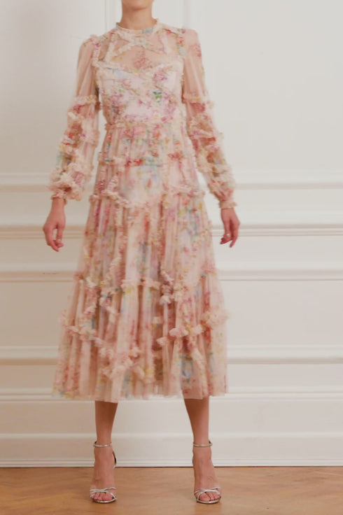 Floral Diamond Ruffle Ballerina Dress in Topaz Pink. This eye-catching piece is crafted from delicate ruffled tulle with an all-over vintage print taken from an early 1900's hand-painted fabric design. A romantic look featuring voluminous cuffed sleeves and a flattering skirt that skims the body to gently increase in fullness, creating stunning movement within the tulle. This Victorian-inspired look with a contemporary edge will be the star of your wardrobe.