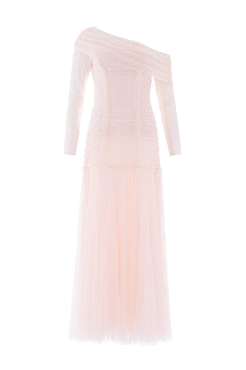 NEW SEASON. The Gigi Dot One-Shoulder Rouched Gown in Cream/Peony Pink. Featuring a playful yet elegant dot design, balanced by a striking one-shoulder silhouette. Finished with flattering ruching through the body, this gown creates a softly sculpted shape for modern occasionwear.