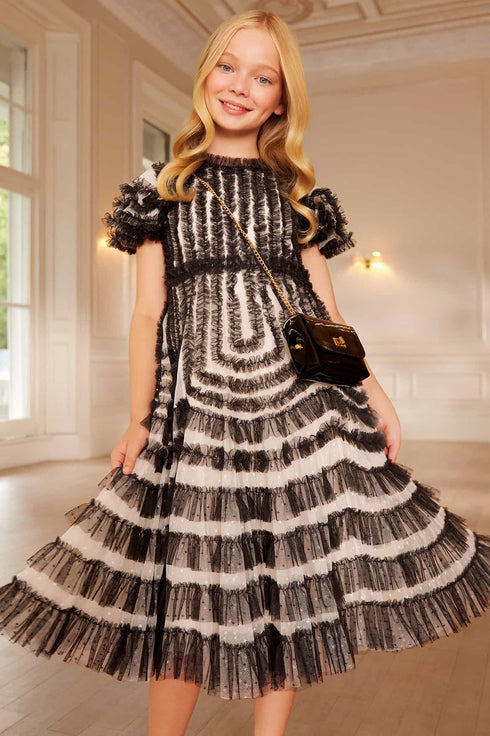 The La Vie En Rose Short Sleeve Kids Dress in Cream/Graphite. This dress is a frothy, romantic style with contrast detailing. Tulle ruffles trim the skirt and bodice in cascading layers, creating a floaty silhouette. Match with Mum with the La Vie En Rose Gown in the same palette for an elegant coordinated look.