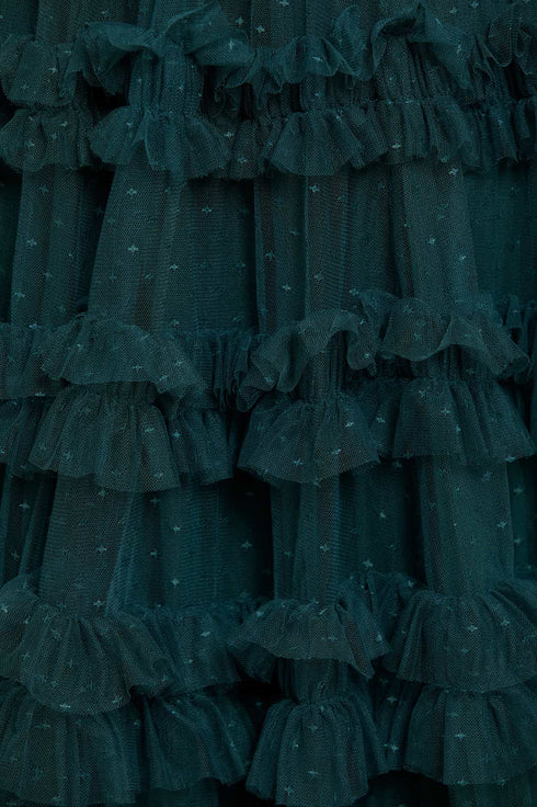 The Lisette Ruffle Off Shoulder Gown in Emerald. This statement gown has an elegant off-the-shoulder design inspired by Hollywood styling. Crafted with textile tulle and double-stitched frills for a dramatic, romantic effect. Features an integrated corset for a perfect fit and to hold the silhouette. Expect all eyes on you in this romantic gown.