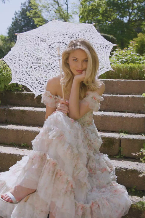 NEW SEASON: The Madame Rose Elodie Off-Shoulder Ankle Gown in Moonshine. This luxurious gown features an archive-inspired rose print, with an off-shoulder neckline framed by layers of gathered ruffles for a romantic, frothy effect. The linear smocking design, intricately embroidered and interspersed with signature Needle & Thread tulle frills, graduates beautifully towards the sweeping hem, enhancing the gown's stunning silhouette. The skirt, crafted from layers of delicate net and tulle, flows with graceful movement. An internal stretch power-mesh corset provides exceptional comfort and fit, while soft boning, encased in grosgrain ribbon, adds exquisite couture detailing. Elastic trim and adjustable hook-and-eye fastenings ensure a versatile and perfect fit.