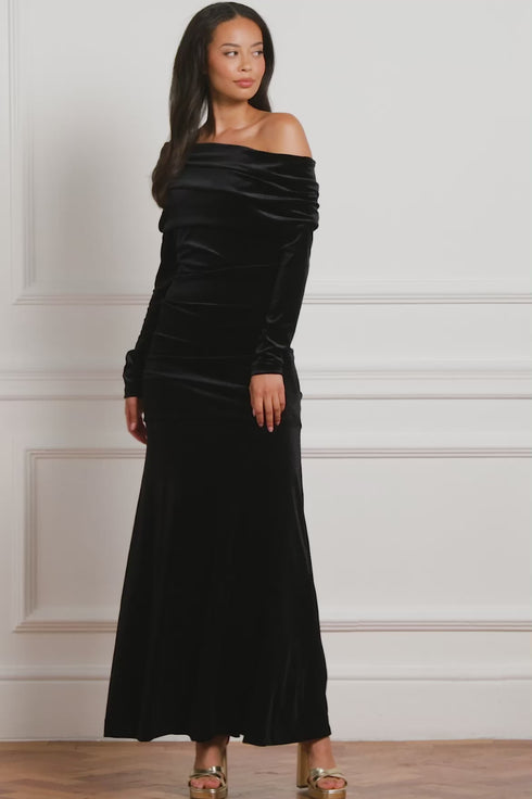 NEW SEASON. The Nova Velvet One-Shoulder Gown in Graphite. A luxurious velvet interpretation of the Bright Star theme. Crafted in a dramatic one-shoulder silhouette, this gown sculpts the figure with elegant precision. The graphite velvet evokes night-sky depth, offering a perfect balance of modern glamour and timeless romance.