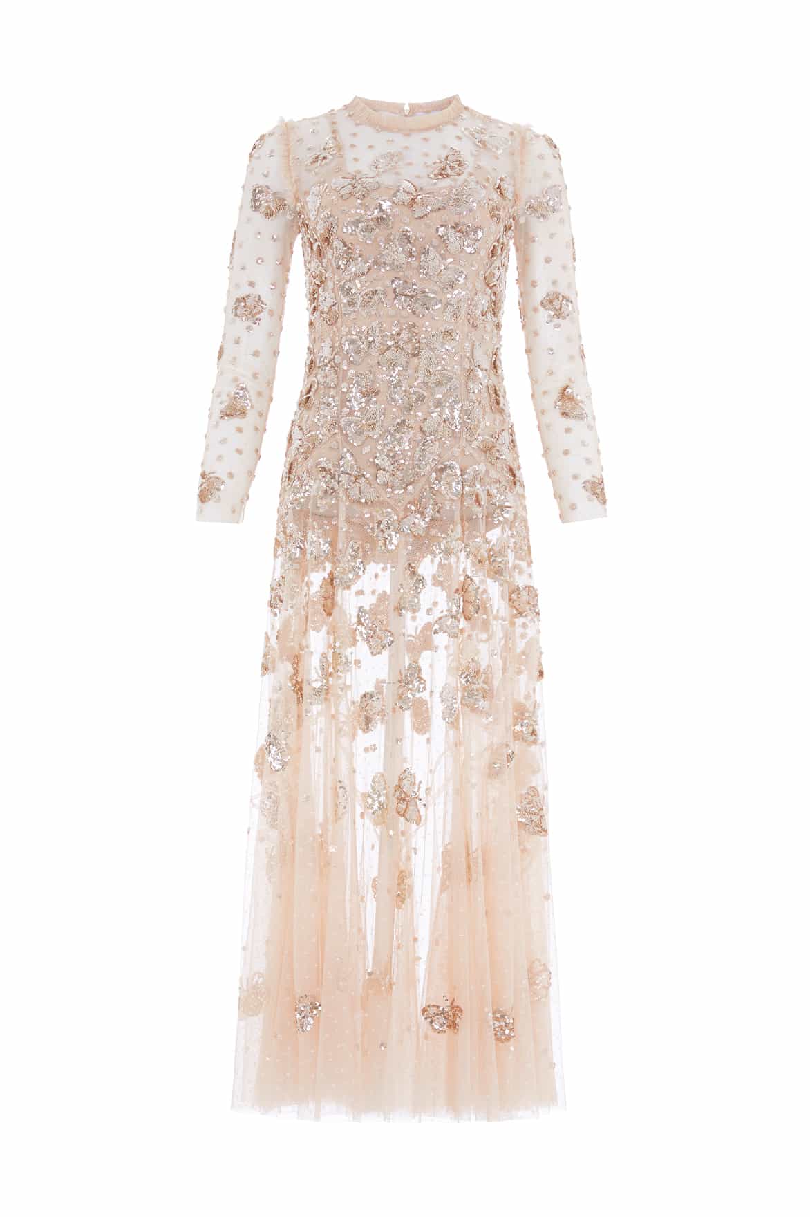 The Papillon Sheer Ankle Gown in Parchment, inspired by the 1900s French ballet La Papillon, features glittering butterfly motifs that trail delicately towards the hem. Decorated with high-shine sequins, enhanced with a glossy foil coating, add extra lustre. This sheer gown includes an integrated stretch scoop-neck bodysuit and slim sleeves adorned with butterfly and glittering dot motifs. The round neckline is finished with signature Needle & Thread tulle frills. Make a statement in this enchanting showstopper.