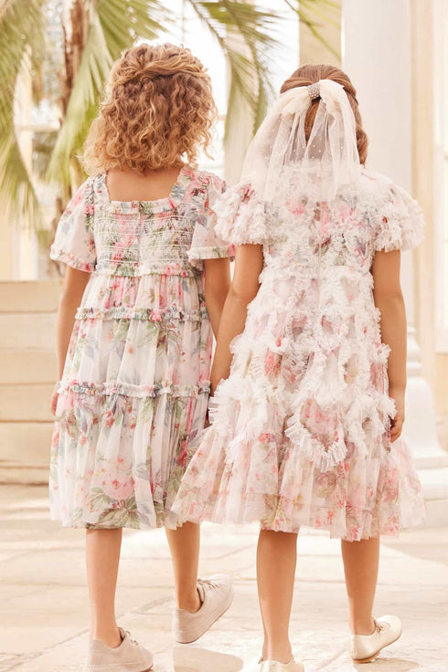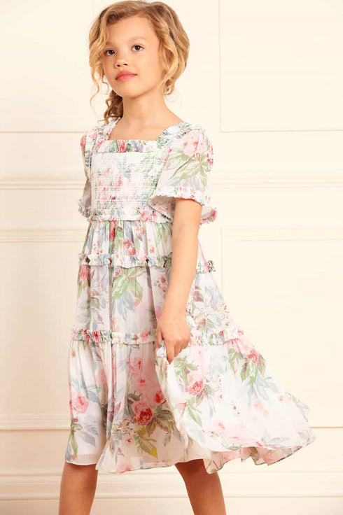 - Floral printed chiffon decorated with elastic smocking and ruffles