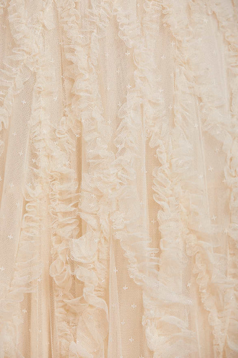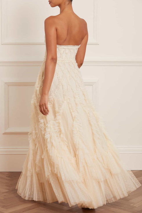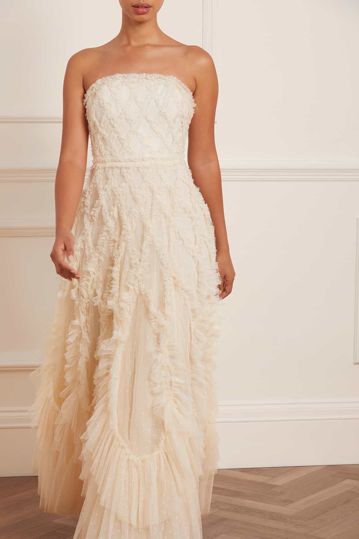 NEEDLE & THREAD EXCLUSIVE. The Rosella Ruffle Strapless Gown in Champagne / Champagne. This show-stopping gown is inspired by Hollywood glamour. This gown is crafted beautifully with dramatic tulle frills for a statement look. Designed with over-sized scallops to create a flattering, elegant silhouette.Featuring an integrated corset made with ribbon stitching, soft boning and panels of stretch mesh fabric for comfort and security in the fit. Expect all eyes on you in the Rosella.
