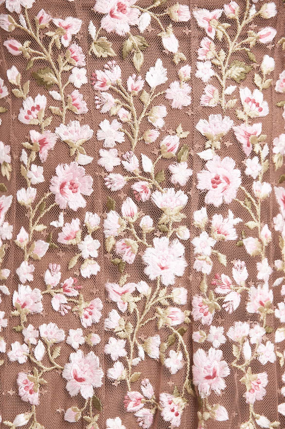 NEW SEASON. The Sylvia Rose Long Sleeve Micro Mini Dress in Warm Taupe. Embroidered roses in tonal threads scatter across soft tulle, paired with long sleeves for coverage. The micro mini length introduces youthful energy, while the warm taupe palette ensures timeless femininity.