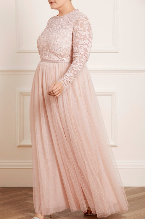 NEEDLE & THREAD EXCLUSIVE. The Tempest Bodice Gown in Strawberry Icing / Pink. Inspired by a vintage lace tablecloth design, this beautiful gown is embellished with shimmering sequins all over the bodice. Designed with long sleeves, a tulle multi-layered skirt and frill trim detailing around the neck. Make an entrance in the Tempest.