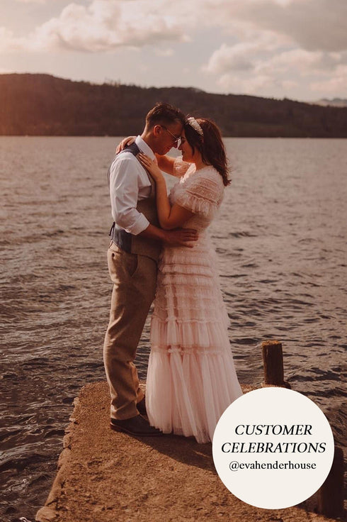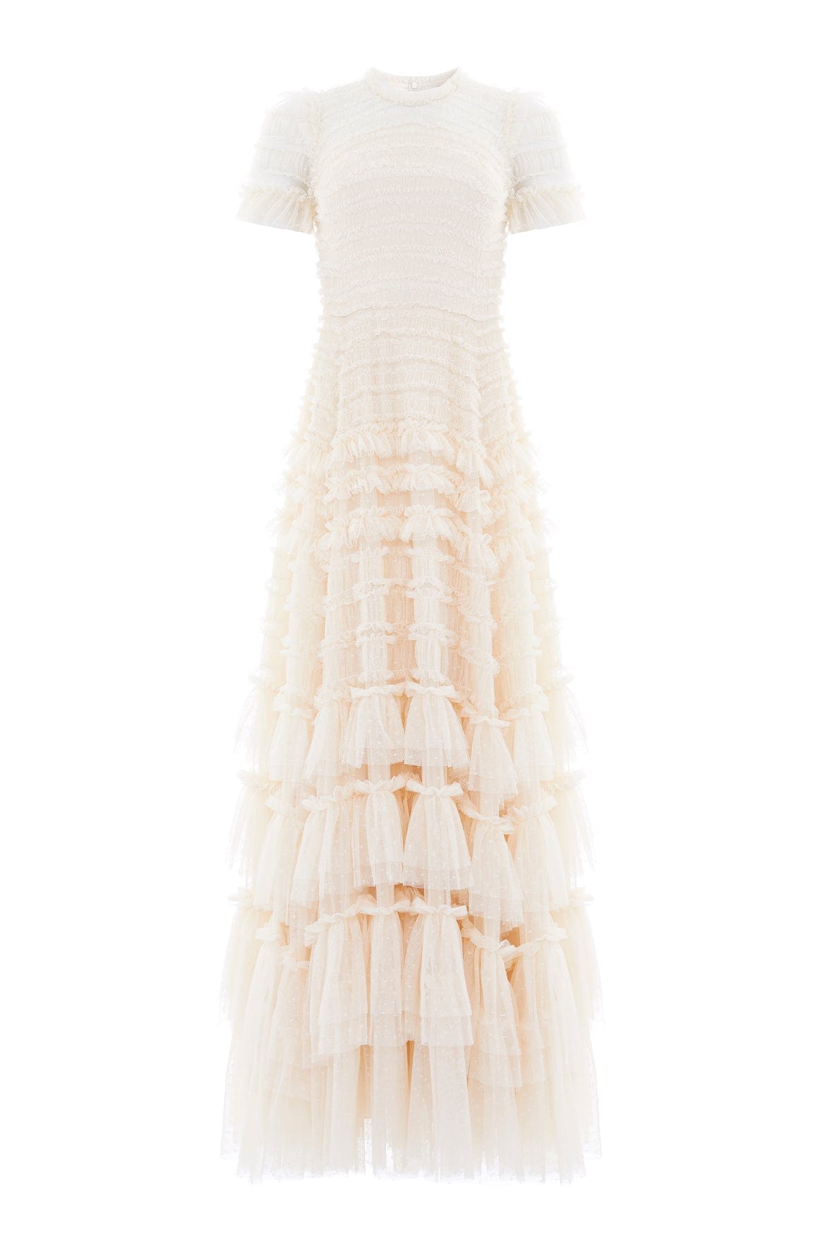 The Valentine Ruffle Gown in Champagne. A signature Needle & Thread style developed with textile ruffles and flattering tulle, creating a romantic look. The ruffles cascade down the dress, starting smaller and gradually getting bigger towards the hem to create soft, fluid movement. Crafted from our signature Needle & Thread kisses tulle. Make a statement in the Valentine.