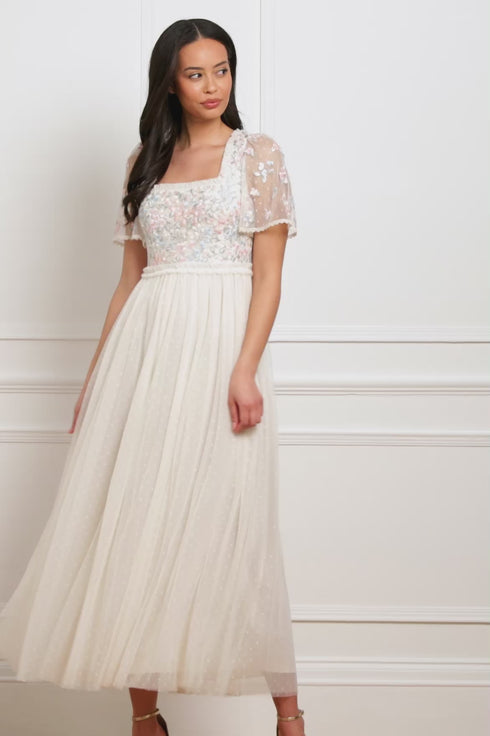The Versailles Ditsy Bodice Ankle Gown in Cream. Inspired by the opulent interiors of the Palace of Versailles, this enchanting gown features intricate multicoloured floral embroidery, densely stitched across the bodice and softened with delicate ditsy motifs along the sleeves. The short sleeves are finished with a fine lace trim, adding a touch of vintage elegance. A square neckline and waist are adorned with signature Needle & Thread tulle frills, enhancing the gown's romantic charm. The skirt cascades in layers of soft, voluminous tulle, creating graceful movement and timeless femininity.