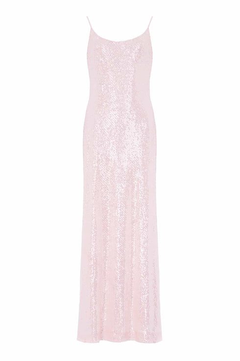 NEW SEASON. The Yvonne Sequin Cami Gown in Seashell. Cut on the bias for an elegant fit. Crafted from stretch mesh covered in shimmering sequins, this gown captures effortless movement and radiant light.