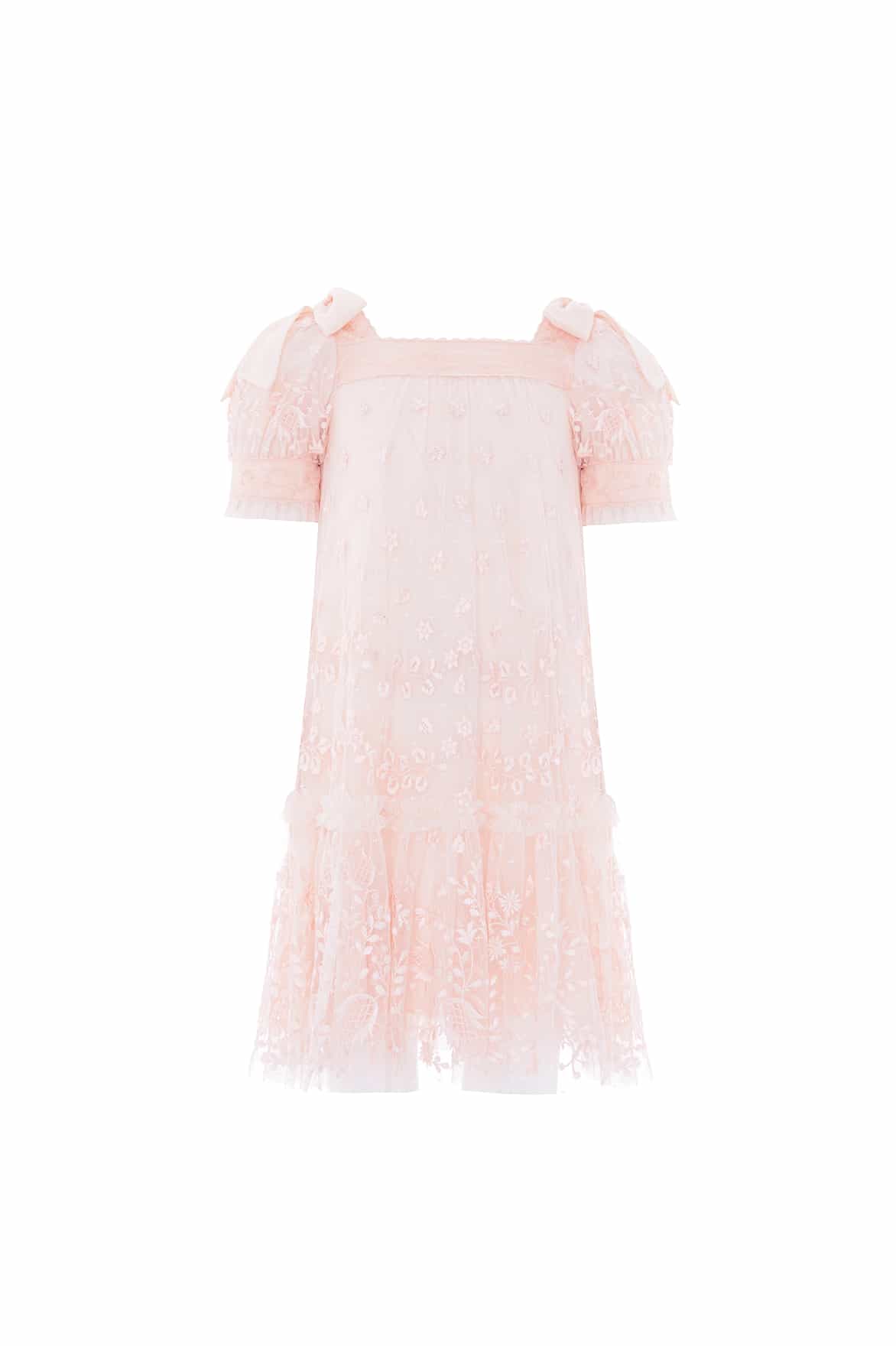 The Alma Kids Dress in Opal. A delicate, vintage-inspired style decorated with floral embroidery across signature Needle & Thread kisses 'x' motif tulle. The soft opal tone and multi-layered skirt creates a beautiful silhouette, perfect for unforgettable moments.