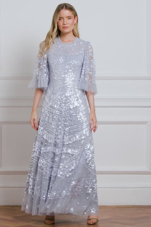 NEW SEASON. The Anais Sequin Gown in Skylight. A luminous statement piece inspired by vintage French lace. Crafted from soft tulle and adorned with shimmering sequins in a delicate border design, this gown features romantic circle-cut frills and fluttering sleeves for graceful movement and timeless allure.