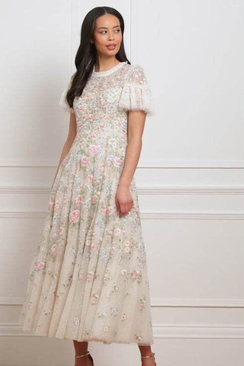 The Antoinettes Floral Round Neck Ankle Gown in Cream. A nod to the lavish beauty of Versailles, the Antoinette Gown showcases exquisite multicoloured floral embroidery, cascading in delicate clusters toward the hem. The round neckline is framed by signature Needle & Thread tulle ruffles, while short sleeves are finished with softly gathered tulle frills for a whimsical touch. Crafted with generous layers of net and tulle, the ankle-length skirt flows into a graceful, sweeping hemline—bringing timeless romance to any occasion.