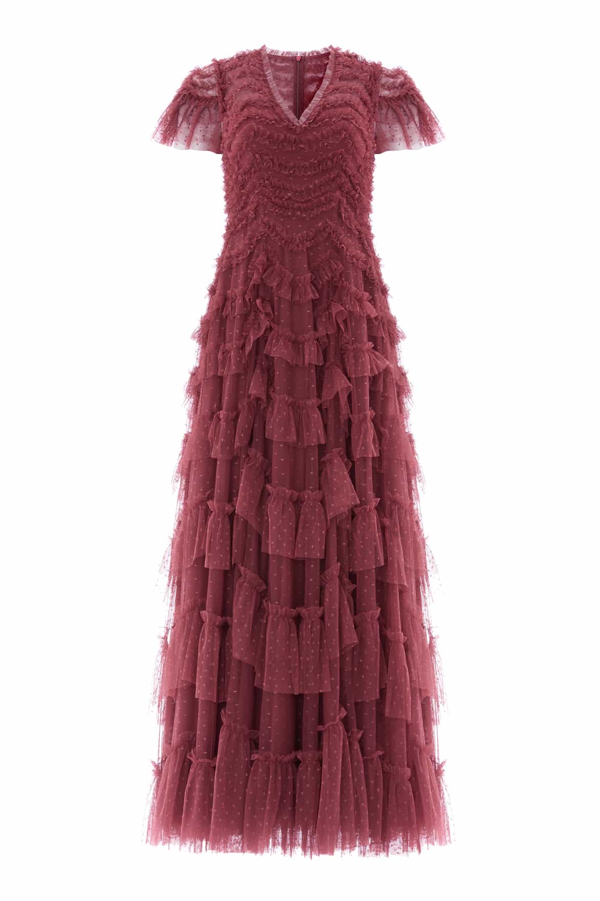 NEW SEASON. The Aviana V-Neck Gown in Winterberry. Rich in tone and romantic in spirit, the Aviana V-Neck Gown brings a seasonal flourish to this iconic silhouette. Featuring cascading scallop frills in deep berry tulle, this piece is crafted to float with every step. The V neckline offers a modern balance to the frothy construction; a striking choice for festive evenings and events.