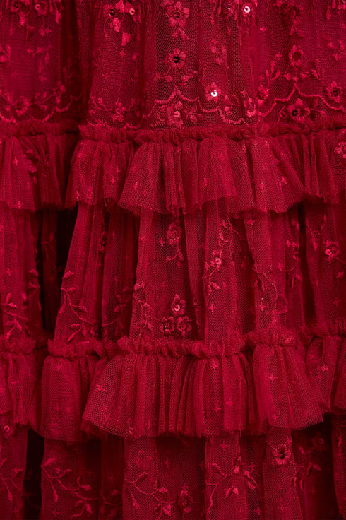 NEW SEASON. The Blossom Lace Ankle Gown in Red. Evoking passion and craftsmanship in equal measure. Layers of sheer tulle embroidered with delicate florals form a flowing, ankle-grazing silhouette. The vivid red hue enhances the feminine detailing and intricate lacework, creating a romantic, heritage-informed look for elegant occasions.