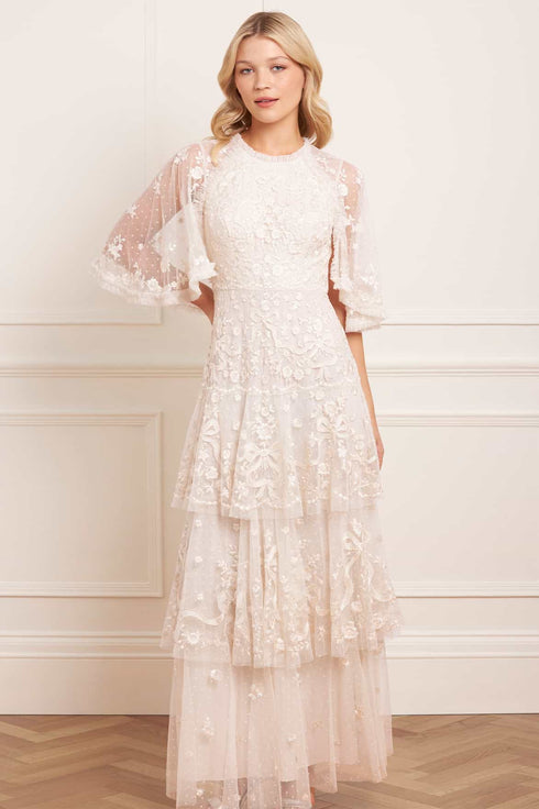 NEW SEASON | NEEDLE & THREAD EXCLUSIVE. The Bonne Bow Gown in Cream/Cream. Inspired by the timeless elegance of 1930s fashion, the Bonnie Bow Gown is a romantic showstopper. Crafted from delicate tulle, it features graceful cape sleeves that add a touch of movement to its flattering silhouette. Intricate ribbon and bow embroidery lends a whimsical charm, while soft, romantic tiers and trims complete the look. Effortlessly feminine and undeniably striking, the Bonnie is made to make an entrance.