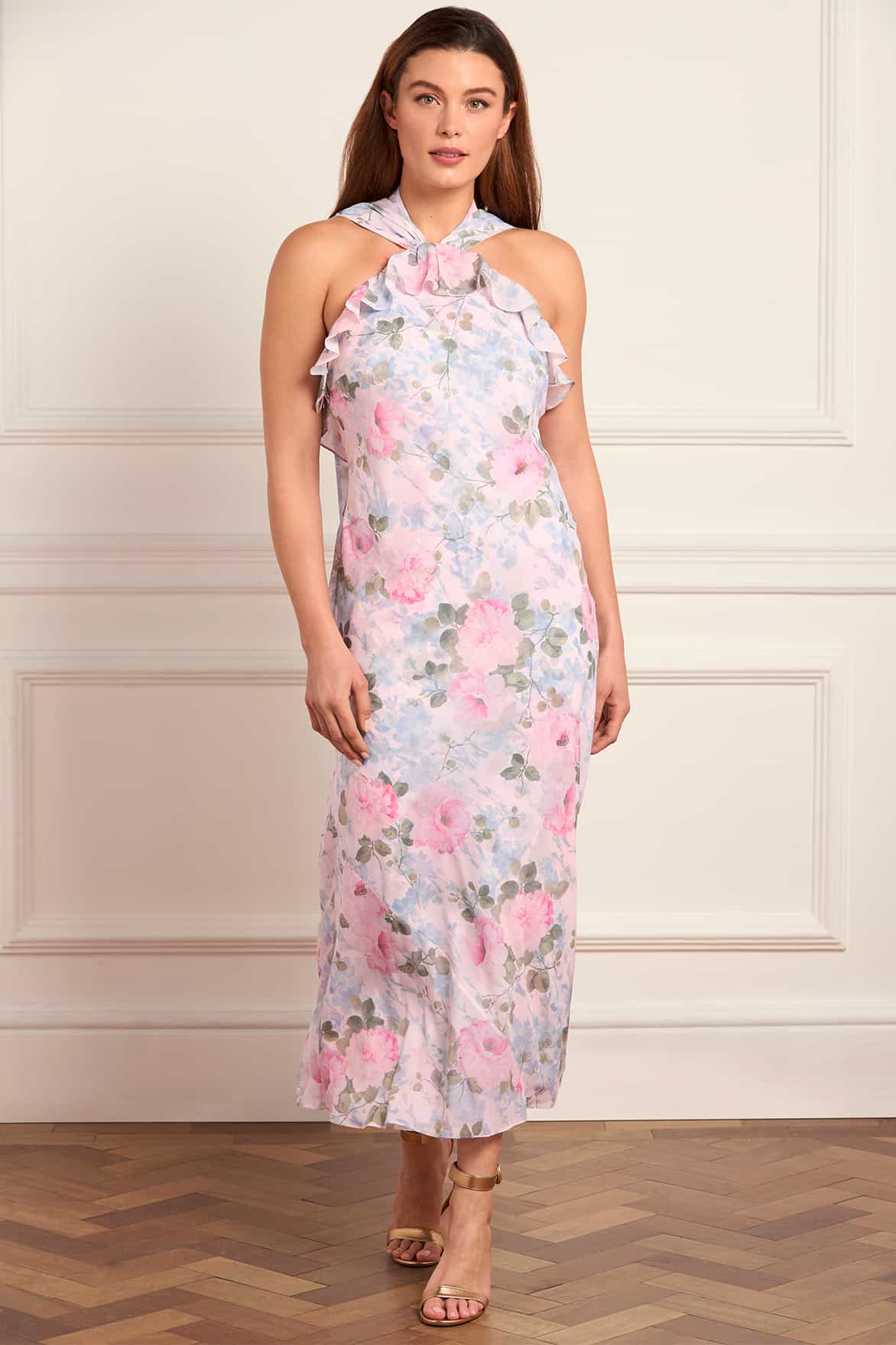 NEW SEASON. The Camille’s Garden Chiffon Halter-Neck Ankle Gown in Seashell. Features a vintage-inspired floral print in soft watercolour tones. Designed with a flattering halter neckline and flowing chiffon skirt, this gown moves beautifully and captures a timeless, romantic spirit.