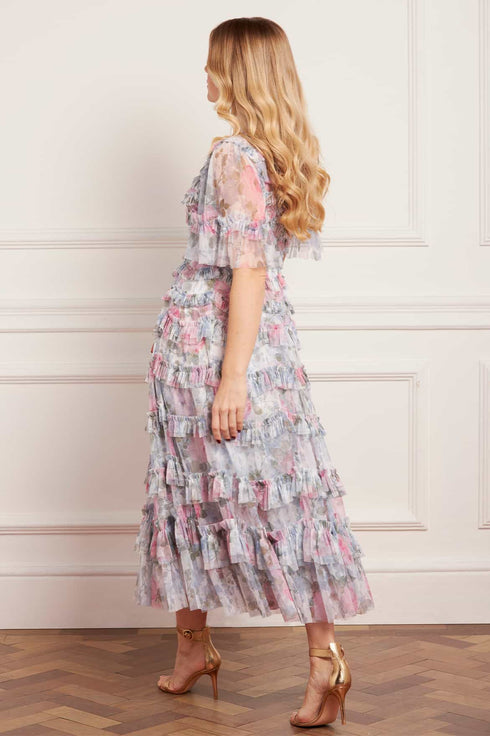 - Floral printed tulle decorated with layers of tulle ruffles.