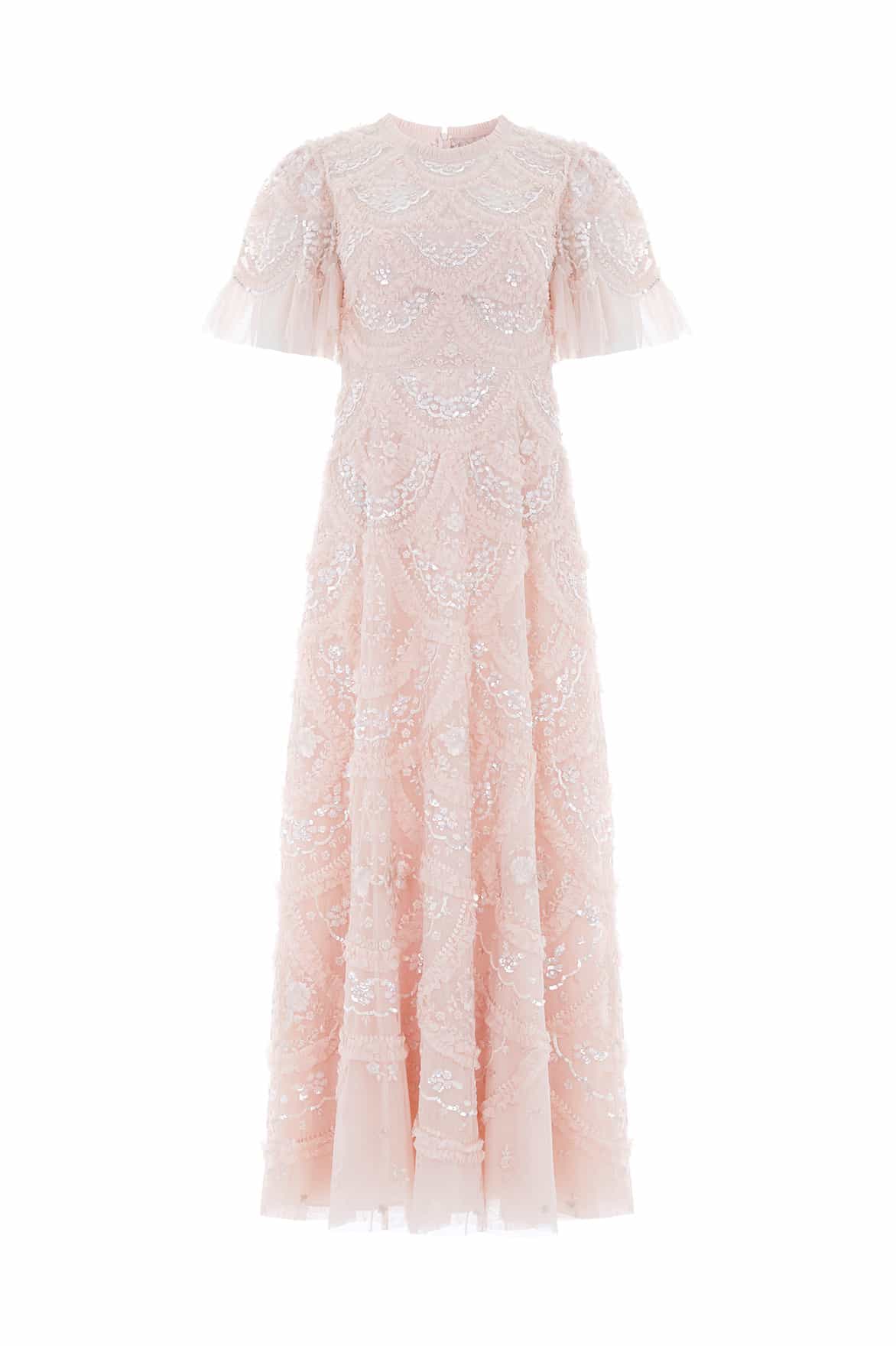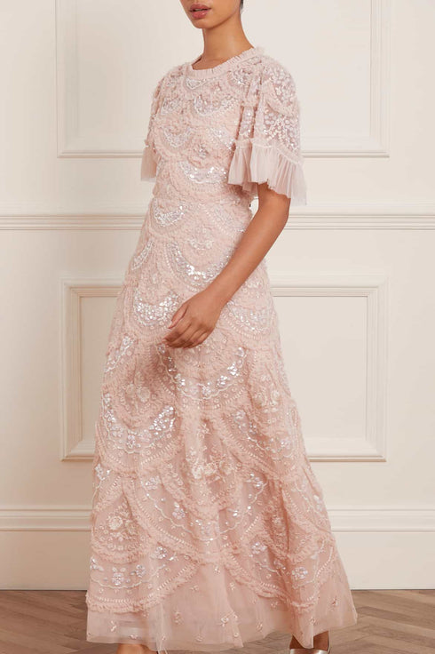 The Carmen Ruffle Ankle Gown in Petal Pink. Where romance meets elegance, the Needle & Thread Carmen Ruffle Ankle Gown is crafted from layers of soft tulle, adorned with exquisite embroidery, and sparkling iridescent sequins to create a beautiful silhouette. Each of the carefully crafted detail evokes the sense of timeless beauty. Layers of tulle give a soft shimmer to gentle ruffles in scalloped sections to create a signature Needle & Thread textured look.