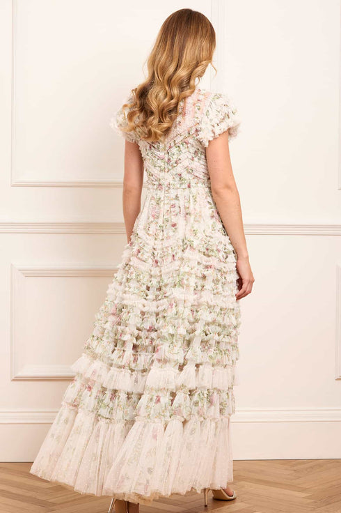 The Colette’s La Vie En Rose Round Neck Short Sleeve Gown in Moonshine/Cream. A dreamy silhouette adorned with delicate tulle frills. Soft ruffles follow the seams of the gown, while romantic florals from the Colette’s Rose print bloom across the moonshine-toned base. A gentle round neckline and short sleeves offer a flattering finish, ideal for refined dressing.