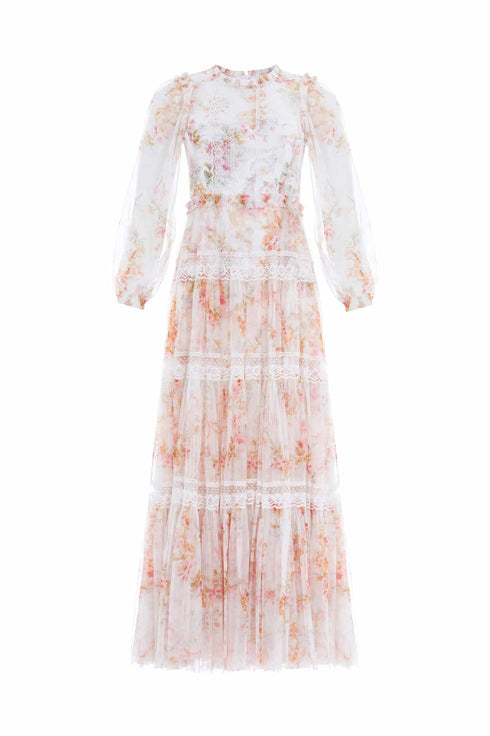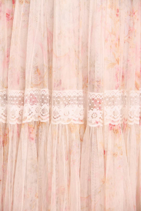 - Floral printed tulle decorated with lace trims