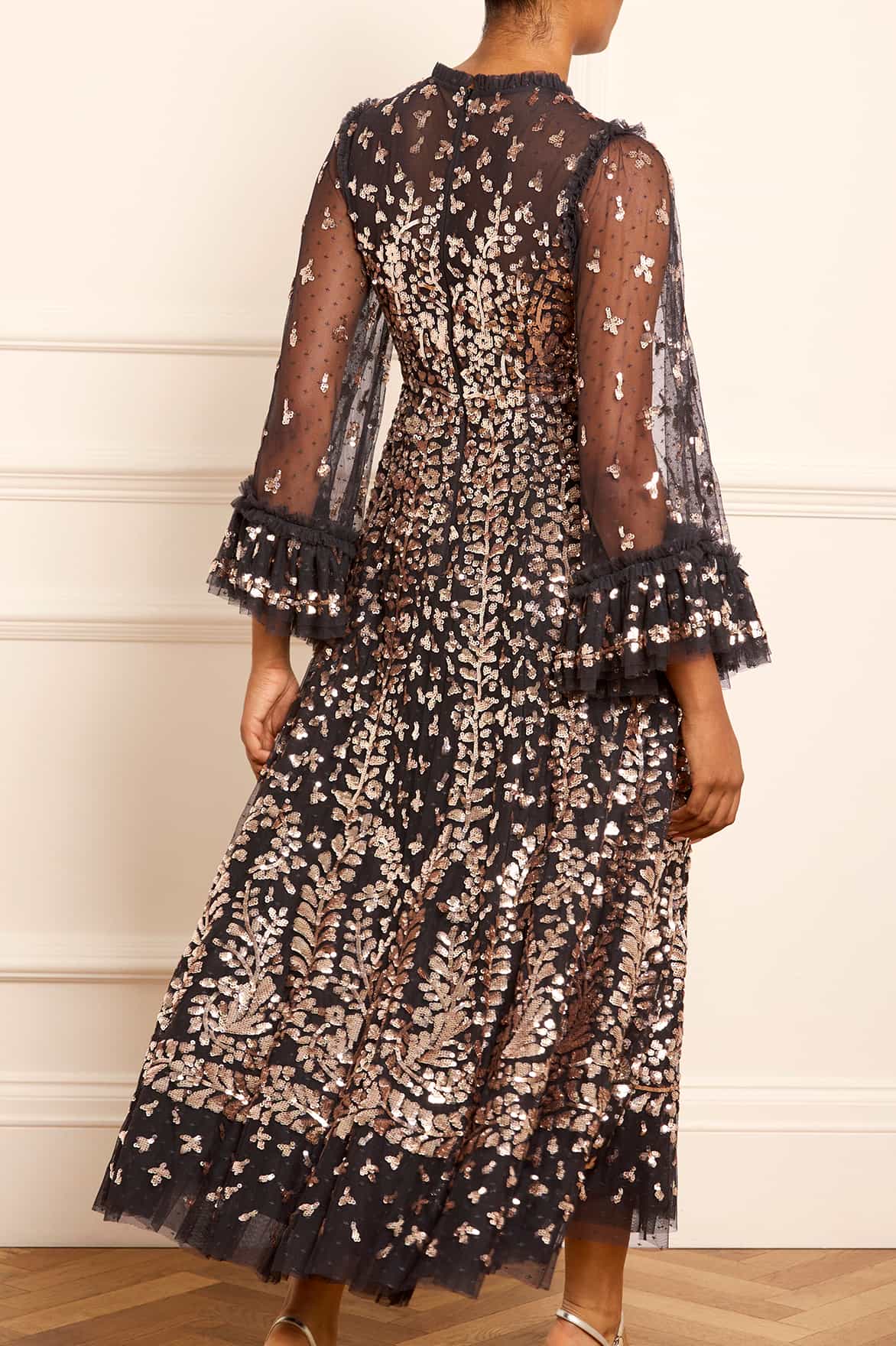 The Fern Ankle Gown in Graphite/Caramel. Inspired by a historical archive artwork, this gown features a shimmering statement sequin border on the skirt hem with a trailing glittering motif design that disperses towards the dress. Crafted in soft tulle with signature Needle & Thread frills, this luxurious style boasts voluminous sleeves with embellished motifs and romantic frills at the cuffs, adorned with glistening sequins. The sequins have a special high-shine gloss finish created by extra foil coating. The skirt is generously made up of layers of soft, delicate tulle and net. A classic and contemporary style.