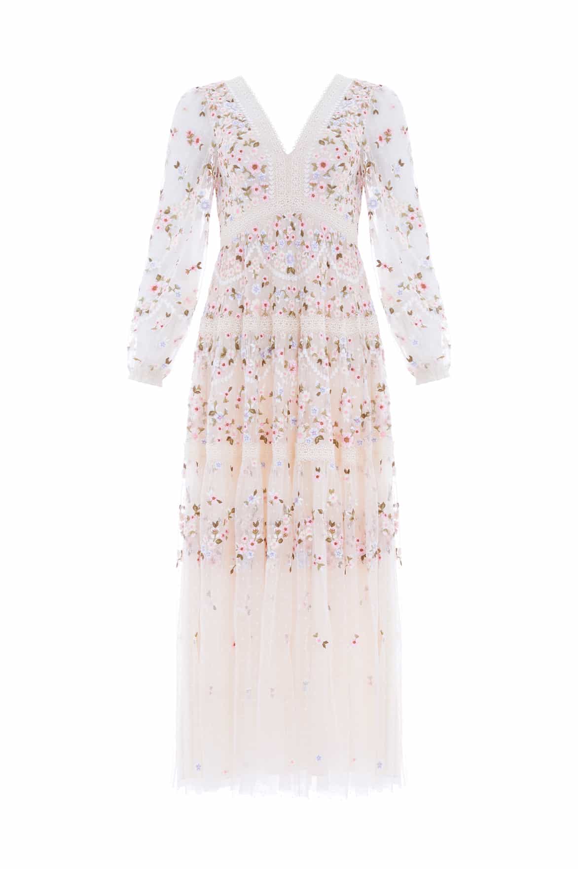 The Garland Ribbon Ankle Gown in Cream This embroidered gown is inspired by Victorian lace trims. Beautifully designed with floral embroidery in soft pastel tones. Developed with a V-shaped waist seam to create a flattering, effortless fit. This gown is adorned with intricate lace trims for signature Needle & Thread detailing. A pretty piece you'll forever treasure.