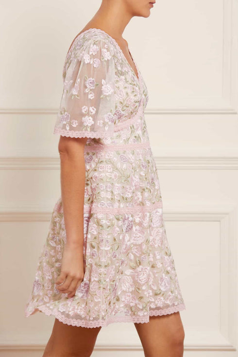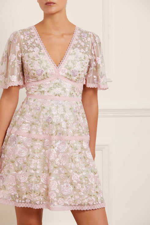 The Lavender Rose Micro Mini Dress in Champagne. This dress is beautifully crafted with romantic rose petal embroidered artwork, inspired by traditional English roses. Featuring floral motifs in soft pastel tones, a classic Needle & Thread silhouette and intricate lace trims for a premium finish. The perfect dress for any occasion.